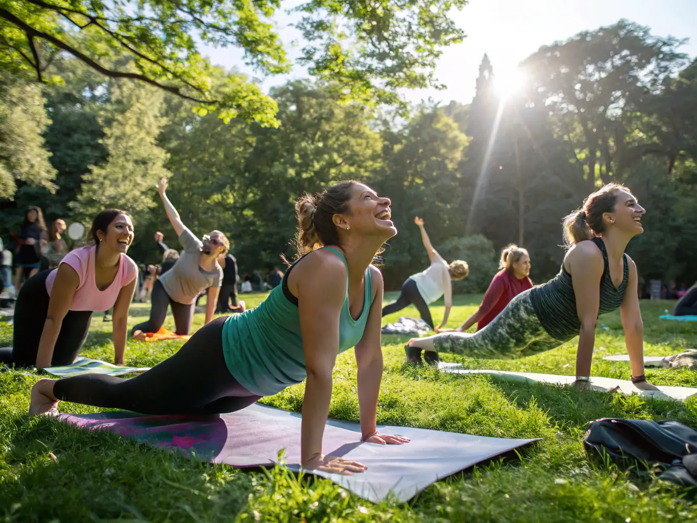 - Adults participating in outdoor fitness classes